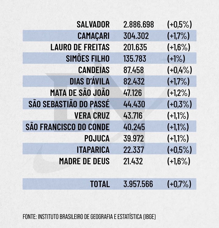 Dos sete municípios com maior crescimento populacional entre 2019 e 2020 no estado, quatro são da RMS: Camaçari (1,7%), Dias D’Ávila (1,7%), Lauro de Freitas (1,6%) e Madre de Deus (1,6%). Mata de São João, Vera Cruz, São Francisco do Conde, Pojuca e Simões Filho também cresceram acima de 1%.