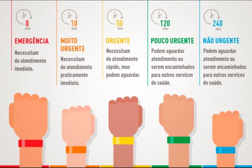 Quando o paciente está em um estado de emergência normalmente a cor é vermelha e significa que ele necessita de atendimento imediato; muito urgente a cor é laranja, cujo atendimento deve ser praticamente imediato; urgente (amarelo) é aquele paciente que precisa de atendimento rápido, mas que pode aguardar por um tempo; e os pouco urgente (verde) ou não urgente (azul) podem aguardar atendimento ou ser encaminhados para outros serviços de saúde. Cada cor também determina o tempo de espera daquele paciente, entenda: