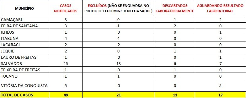 De acordo com o boletim atualizado, a Bahia registrou 49 notificações, tendo sido 21 excluídos por não se enquadrarem no protocolo do Ministério da Saúde. Dos demais, 11 foram descartados laboratorialmente e 17 aguardam análise laboratorial.